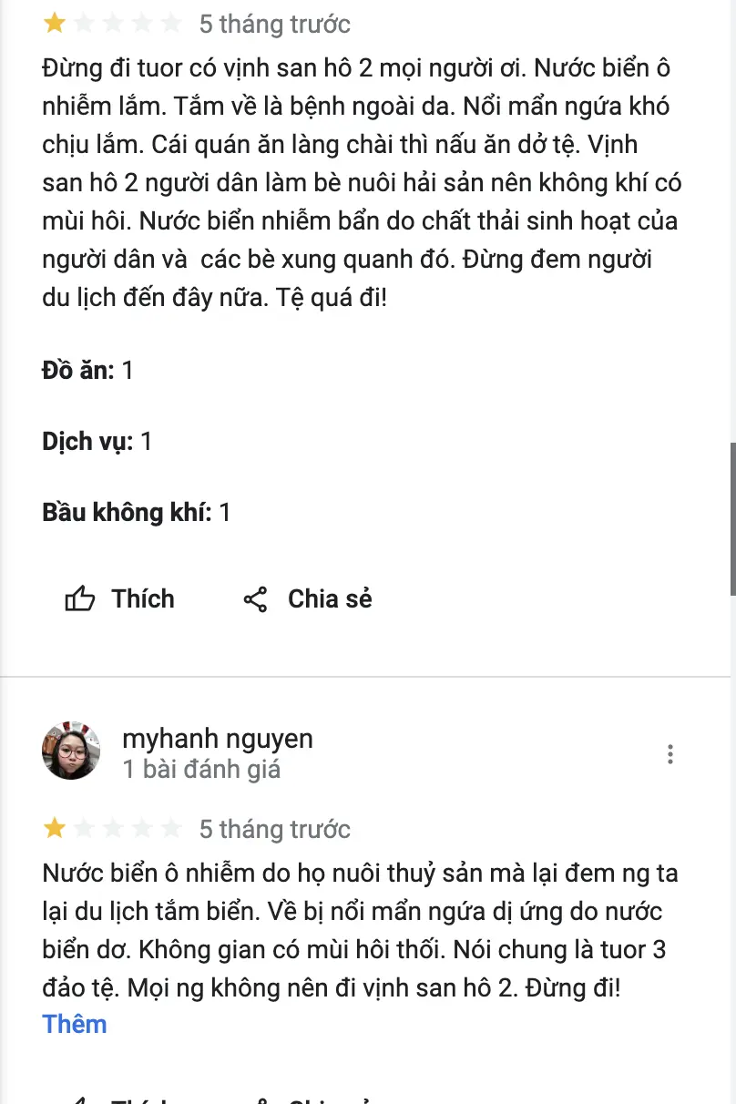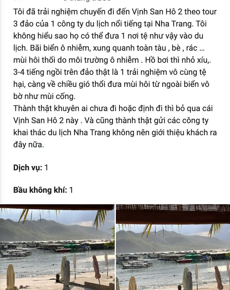 Vịnh San Hô 2, một trong những điểm đến được nhắc đến trong các tour du lịch ở Nha Trang, đã nhận được khá nhiều phản hồi từ khách hàng trên Google. Tính đến ngày 1/1/2025, trong hơn 50 đánh giá hiện có, nơi đây nhận về không ít ý kiến tiêu cực. Một trong những vấn đề được phản ánh nhiều nhất là tình trạng ô nhiễm nước biển. Theo ý kiến của một số du khách, khu vực này nằm gần vị trí nuôi hải sản của các lồng bè, gây ảnh hưởng đến chất lượng nước. Hậu quả là có những khách hàng gặp phải tình trạng ngứa ngáy và dễ mắc các bệnh ngoài da sau khi tiếp xúc với nước biển tại đây.