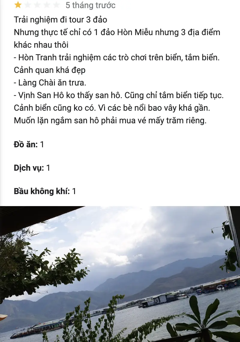 Ngoài ra, một số du khách còn cảm thấy không hài lòng với cách tổ chức của tour. Cụ thể, họ cho biết rằng tour “3 đảo” mà họ tham gia thực chất chỉ đưa khách đến một đảo, nhưng lại chia ra thành 3 điểm tham quan khác nhau trên cùng một đảo. Điều này khiến họ cảm thấy không đúng với tên gọi “tour 3 đảo Nha Trang” và có cảm giác bị đánh lừa. Những ý kiến này đã phần nào làm giảm thiện cảm của du khách đối với Vịnh San Hô 2 cũng như các tour du lịch liên quan tại khu vực này.