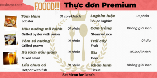 Đây là đặc quyền chỉ có ở Hòn Tằm Business Tour. Mỗi khách hàng sẽ được tặng một tôm hùm nguyên con và chế biến theo yêu cầu riêng của mình. Tất cả các loại hải sản trong bữa trưa đều là hải sản sống của địa phương, các loại rau củ đều là sản phẩm tươi ngon trên đảo Trí Nguyên.
