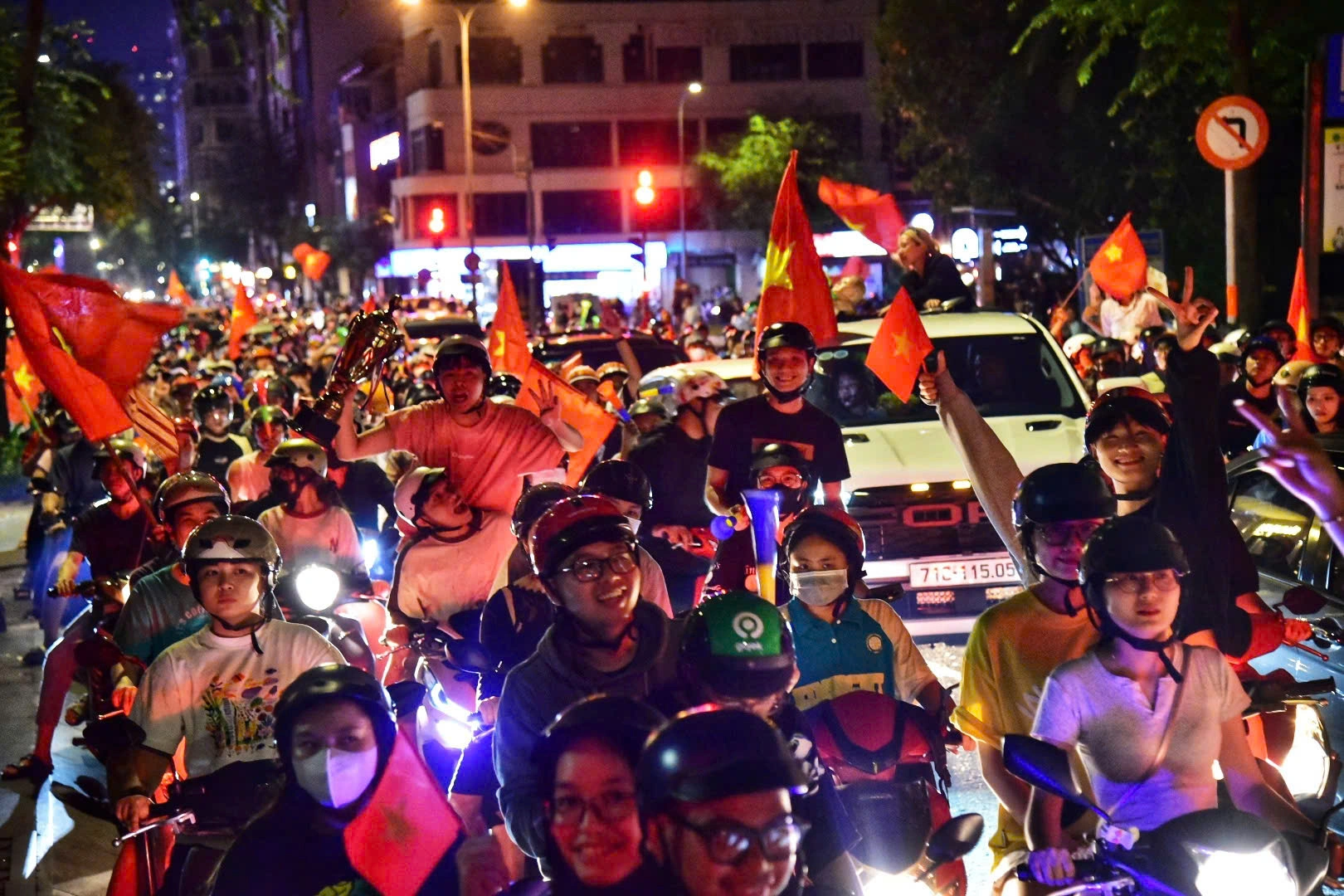 Tại thủ đô Hà Nội, những tuyến phố trung tâm như Hoàn Kiếm, Tràng Tiền sáng rực ánh đèn và rợp màu cờ đỏ sao vàng. Hàng nghìn người tay trong tay hô vang “Việt Nam vô địch!”, tiếng kèn vang vọng khắp các góc phố, biến đêm mừng chiến thắng thành một ngày hội thực sự. Ở Đà Nẵng, cầu Rồng nổi bật giữa dòng sông Hàn cũng trở thành tâm điểm của sự cuồng nhiệt khi hàng ngàn người dân và du khách cùng diễu hành, nhảy múa dưới ánh sáng rực rỡ của màn trình diễn pháo hoa bất ngờ.