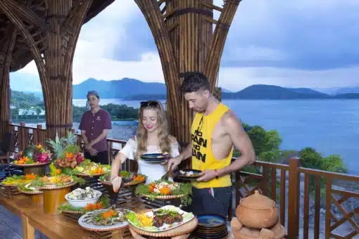 - Thưởng thức Buffet trưa thịnh soạn tại Nhà hàng Hồn Việt (Khu A) : Sau buổi sáng tràn đầy năng lượng, bạn sẽ được chiêu đãi bữa trưa buffet đa dạng các món ăn Á – Âu hấp dẫn tại Nhà hàng Hồn Việt. Với không gian sang trọng, hiện đại và tầm nhìn hướng biển tuyệt đẹp, đây là địa điểm lý tưởng để nạp lại năng lượng, thưởng thức ẩm thực tinh tế và ngắm nhìn cảnh quan kỳ vĩ của vịnh Nha Trang.